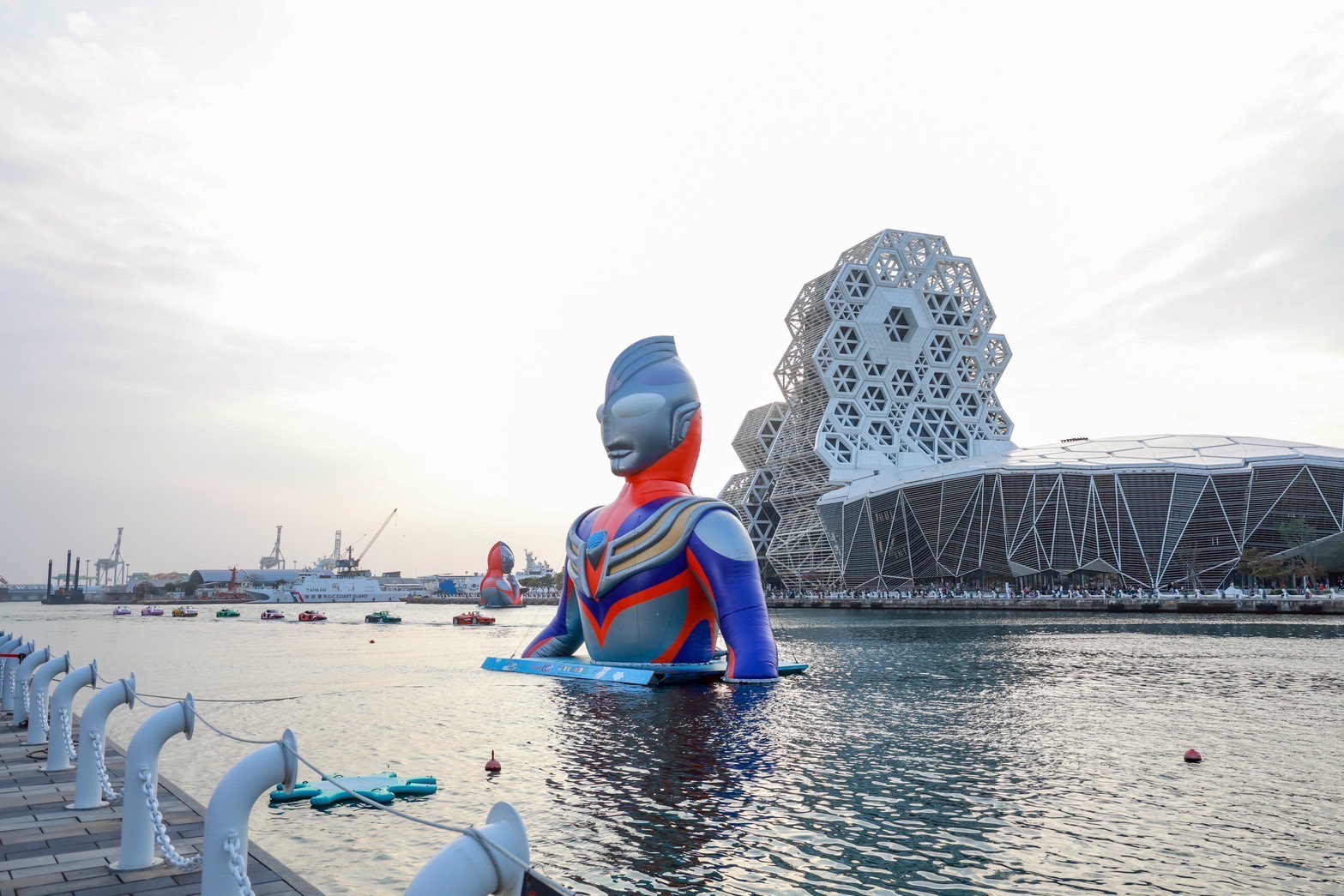 圖說:兩座高15米的「初代超人力霸王」及「超人力霸王迪卡」巨型作品帥氣現身愛河灣。(圖片來源:高雄市政府提供)