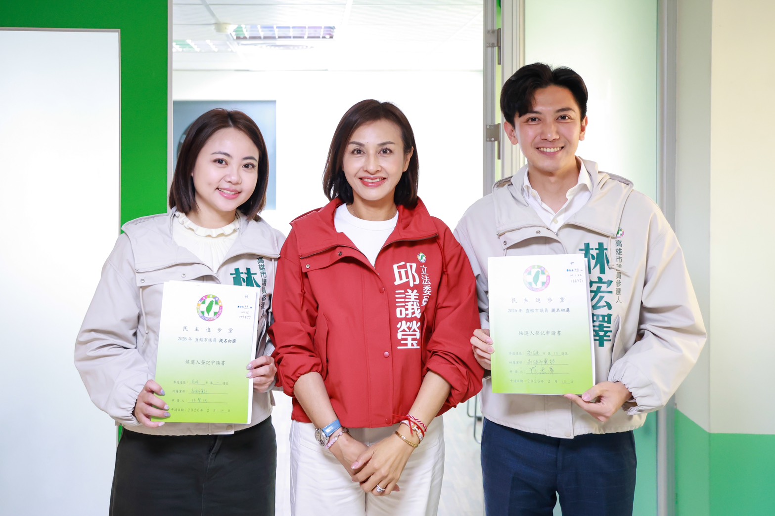 民進黨高雄市議員將於三月舉行初選,立法委員邱議瑩10日親自陪同兩名子弟兵林浤澤、林慧欣赴黨部登記;邱議瑩表示,兩位都是深耕在地的優秀年輕人才,期許二人都能夠獲得市民支持,進入議會為鄉親服務,「疼惜邱議瑩,牽成林浤澤、林慧欣」。