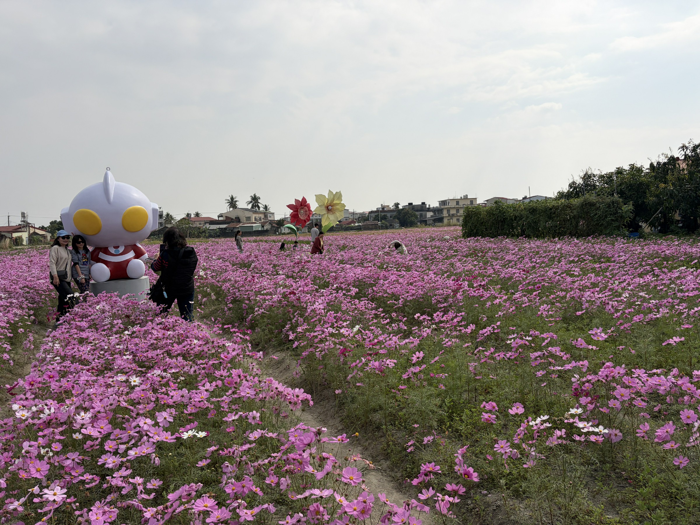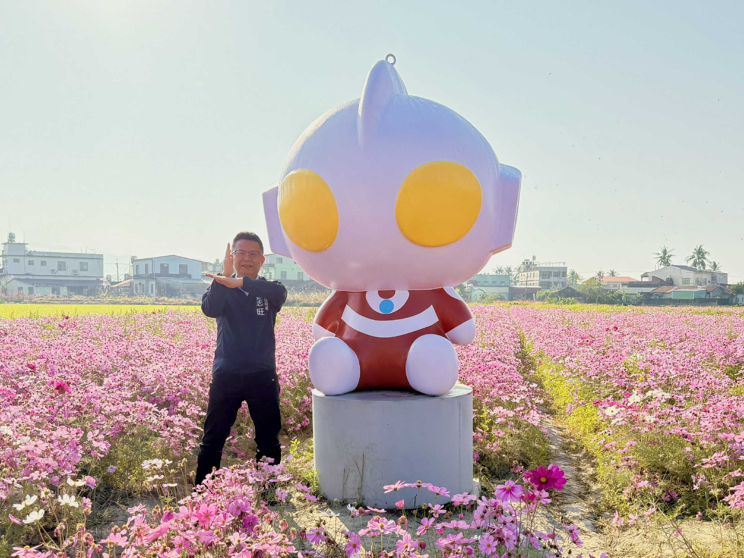杉林區則自去年12月「歲暮杉林花海音樂會」率先揭開序幕,2公頃大波斯菊與百日草花海繽紛盛開,春節期間更將擴展至約27公頃花田接力綻放,形成層層花浪景觀。超人力霸王迪卡與哥摩拉佇立花間,營造動漫角色與自然景致交融的獨特畫面,為農村觀光增添話題。