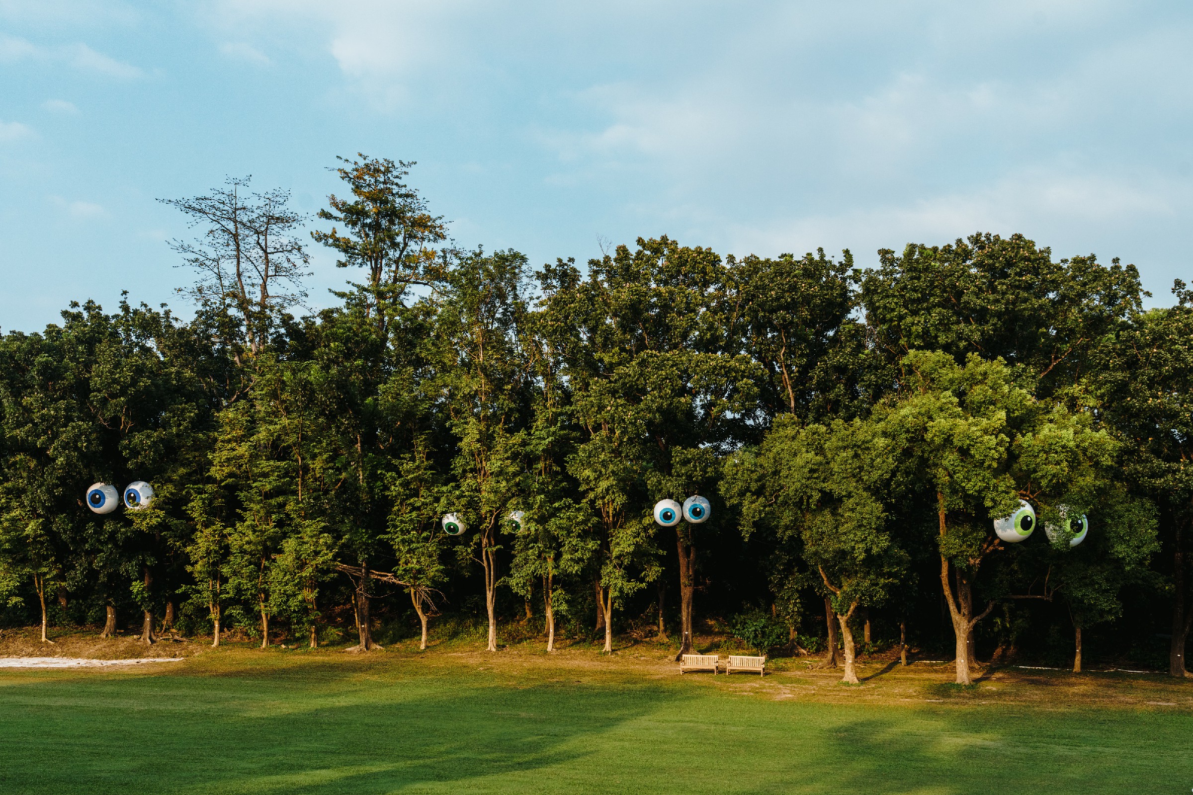 ↑圖說:英國藝術家痞子路克(Filthy Luker)的作品《果嶺大眼睛》,讓森林長出了生動的表情。(圖片來源:高雄市文化局提供)