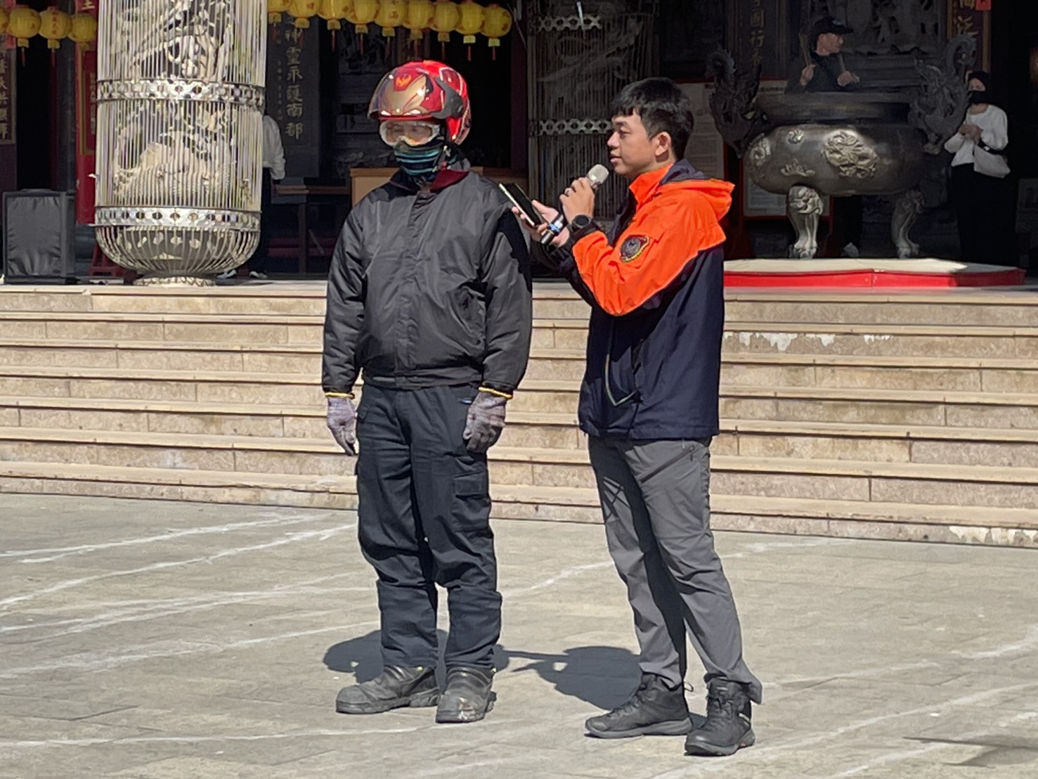 ↑圖說:消防局人員於活動現場示範煙火施放安全防護裝備,提醒民眾配戴護目鏡、手套及防護衣物,確保元宵花火活動在安全無虞下進行。(圖片來源:記者林薇安攝)
