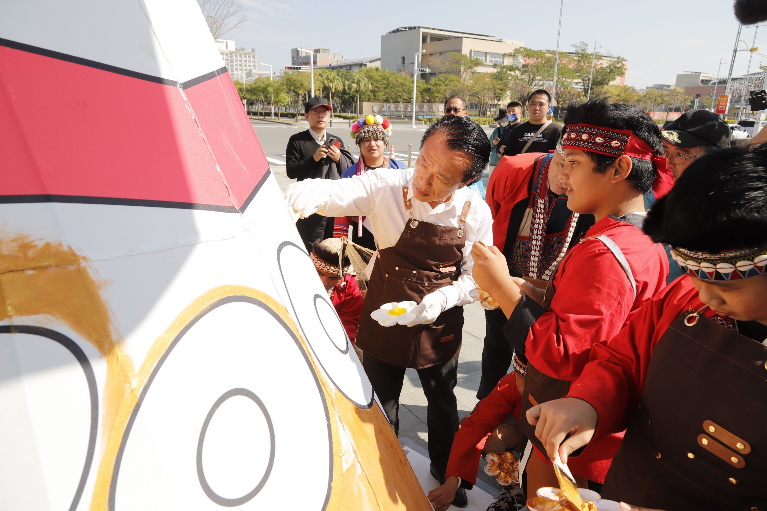 ↑圖說:翁章梁走入鄒族燈區「神之境」,與策展人鄭佩茜、族人孩童共同彩繪「迎賓之心」燈組(圖片來源:嘉義縣新聞處提供)