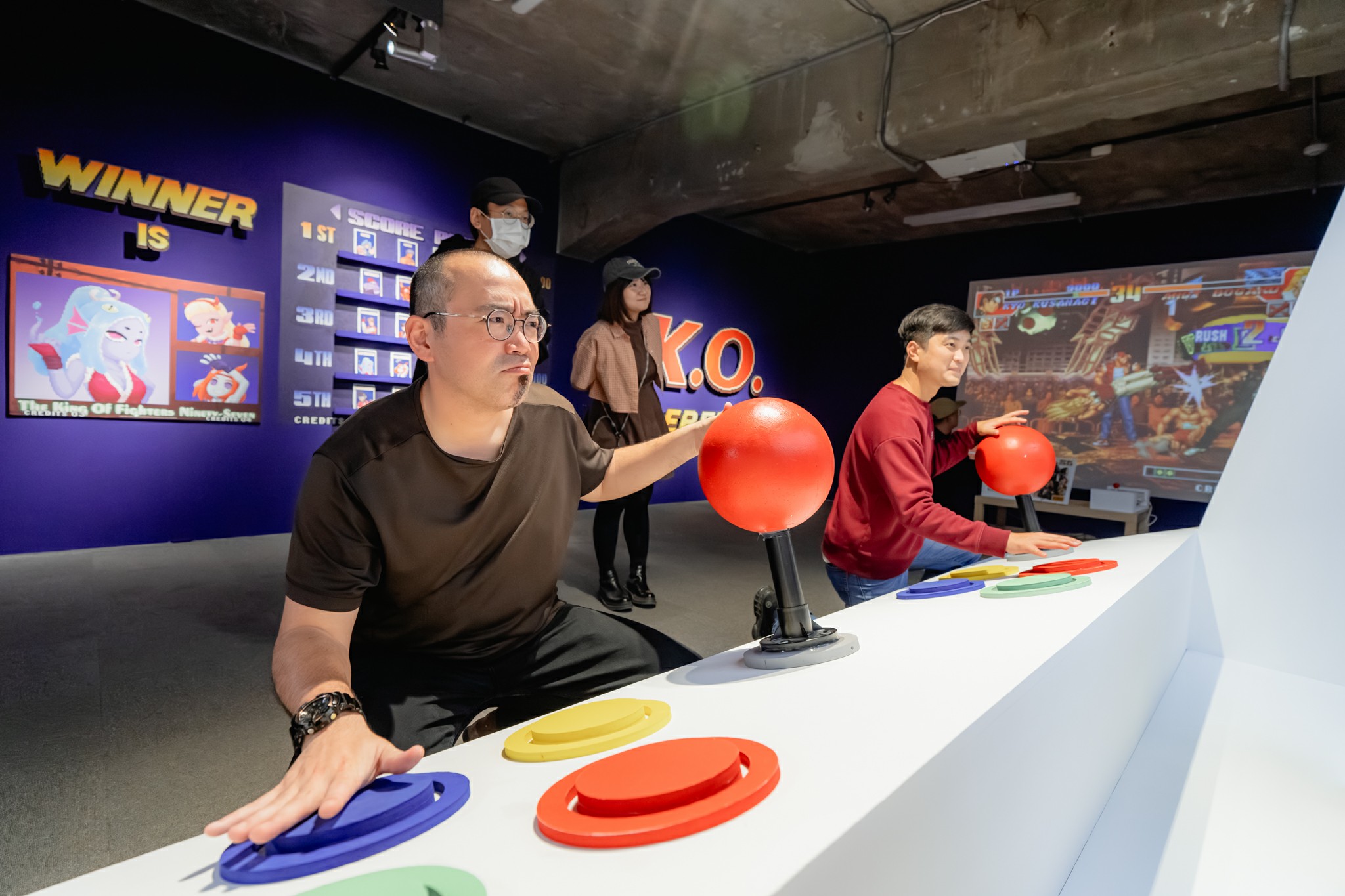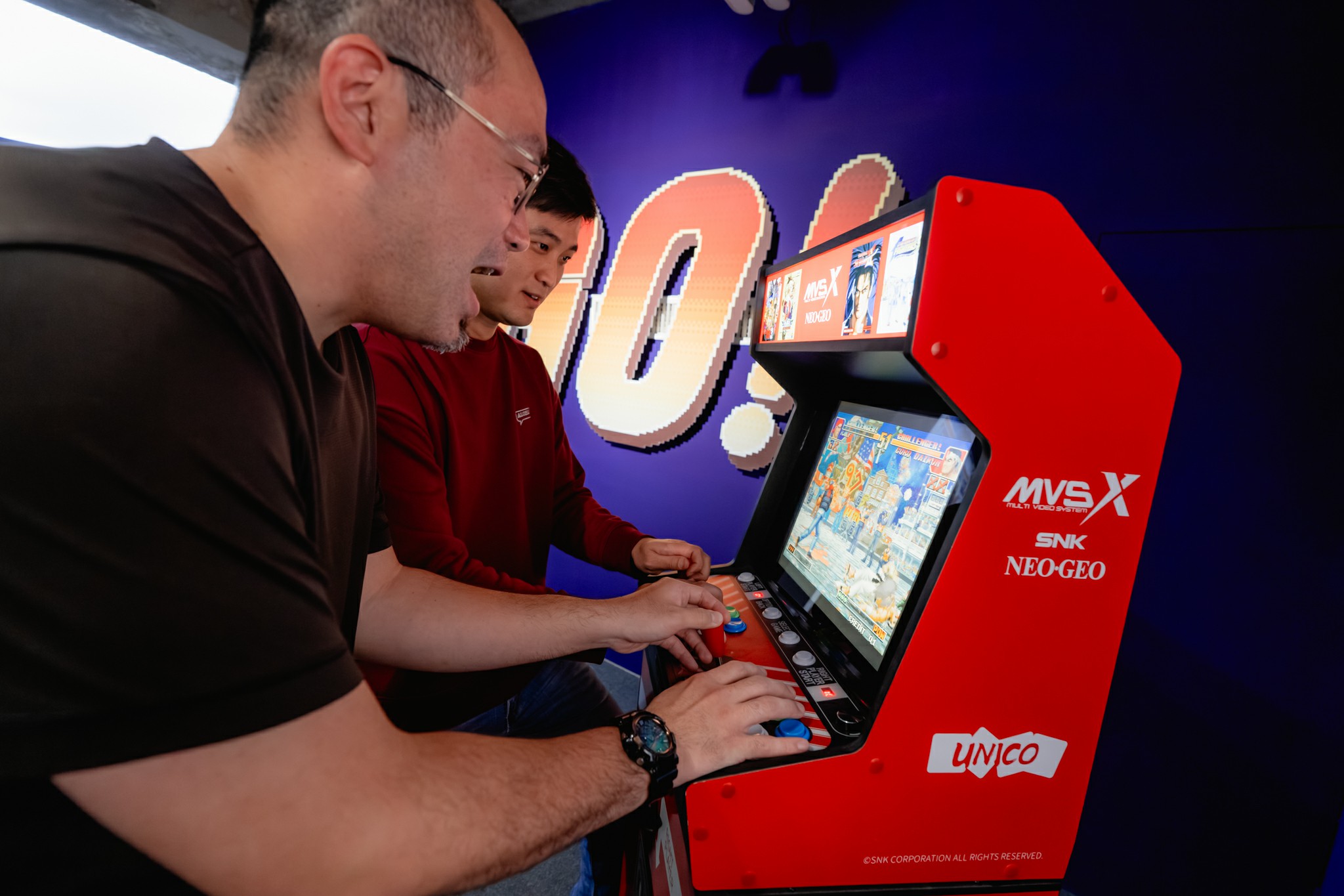 走進展場入口,即可見多組《拳皇’97》經典角色以像素風格立牌迎賓,「Ready」、「GO!」等遊戲提示語則化為動線設計元素,引導觀眾步入彷彿實境對戰的空間。現場設置SNK NEOGEO MVSX Home Arcade街機與NEOGEO Arcade Stick Pro操作搖桿,讓玩家親手重溫當年在街機台前對戰的操作手感與臨場快感。