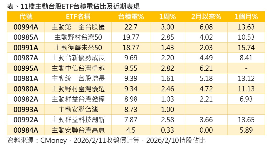 台積電一路帶領台股創新高,成為多頭指標,由基金經理人選股操盤的主動式台股ETF,也沒有錯過台積電,均納入成分股,但因多數有單一持股上限,因此僅少數持股比重可近2成甚至更高,其中,00994A主動第一金台股優、00985A主動野村台灣50,00991A主動復華未來50,配置比重較高。