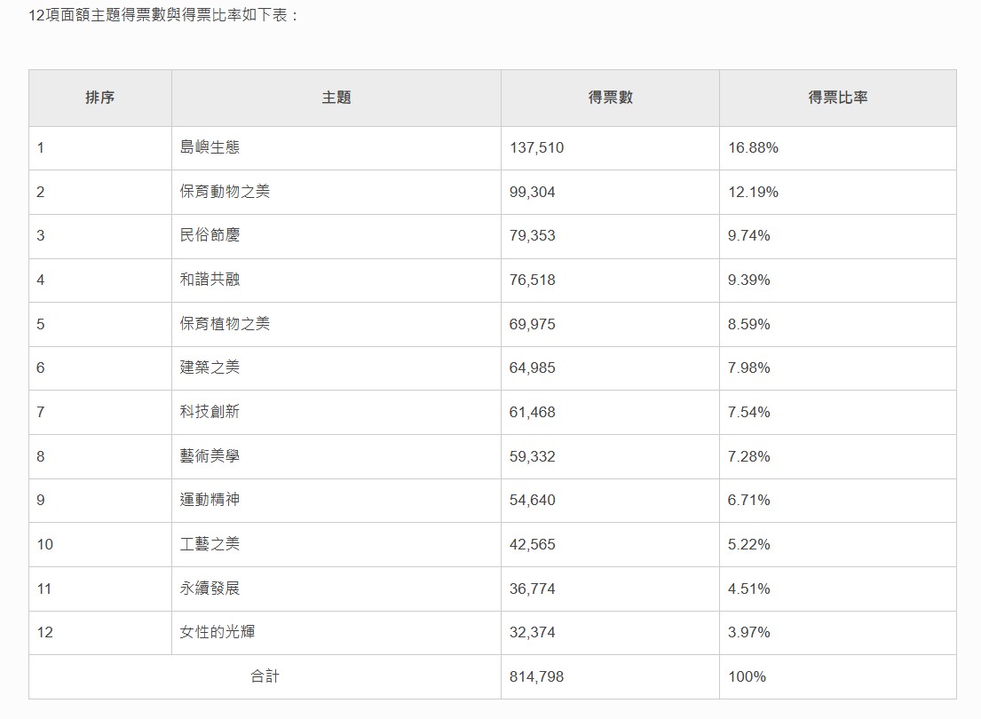 12項面額主題得票數與得票比率如下表: