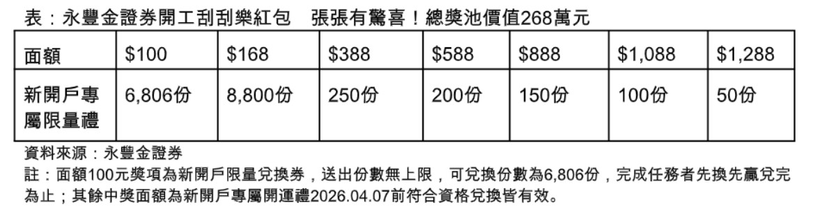 永豐金證券希望透過「總獎池價值268萬刮刮樂紅包大放送」降低投資門檻,開工紅包讓投資人不僅可享極具年節氛圍的刮刮樂體驗,更能掌握第一季布局良機。