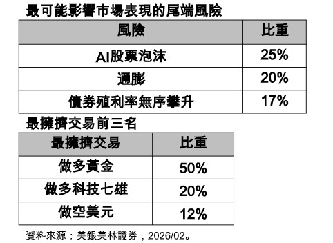 尾端風險部分,「AI股票泡沫」以25%的比例再度成為最可能的尾端風險,通膨與債券殖利率無序攀升則分列二、三名,地緣政治衝突滑落至第四名。