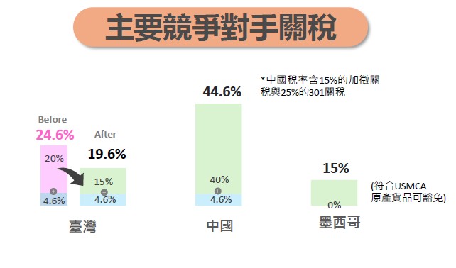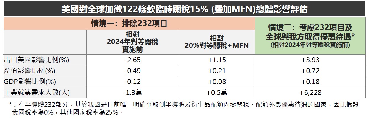 •情境二:考慮232項目及全球與我方取得優惠待遇,包含我汽車零件與木材傢俱15%;半導體已課稅產品我國為0%,他國為25%(我國是目前唯一明確爭取到半導體及衍生品配額內零關稅、配額外最優惠待遇的國家)