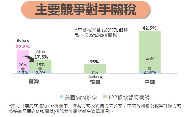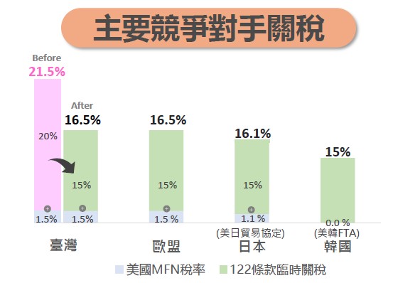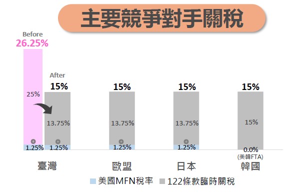 機械產業部分,122條款臨時關稅加徵後我國與主要競爭對手國如歐盟稅率相同,與日本、韓國相比關稅差距不大(約0.4%–1.5%),評估影響有限。