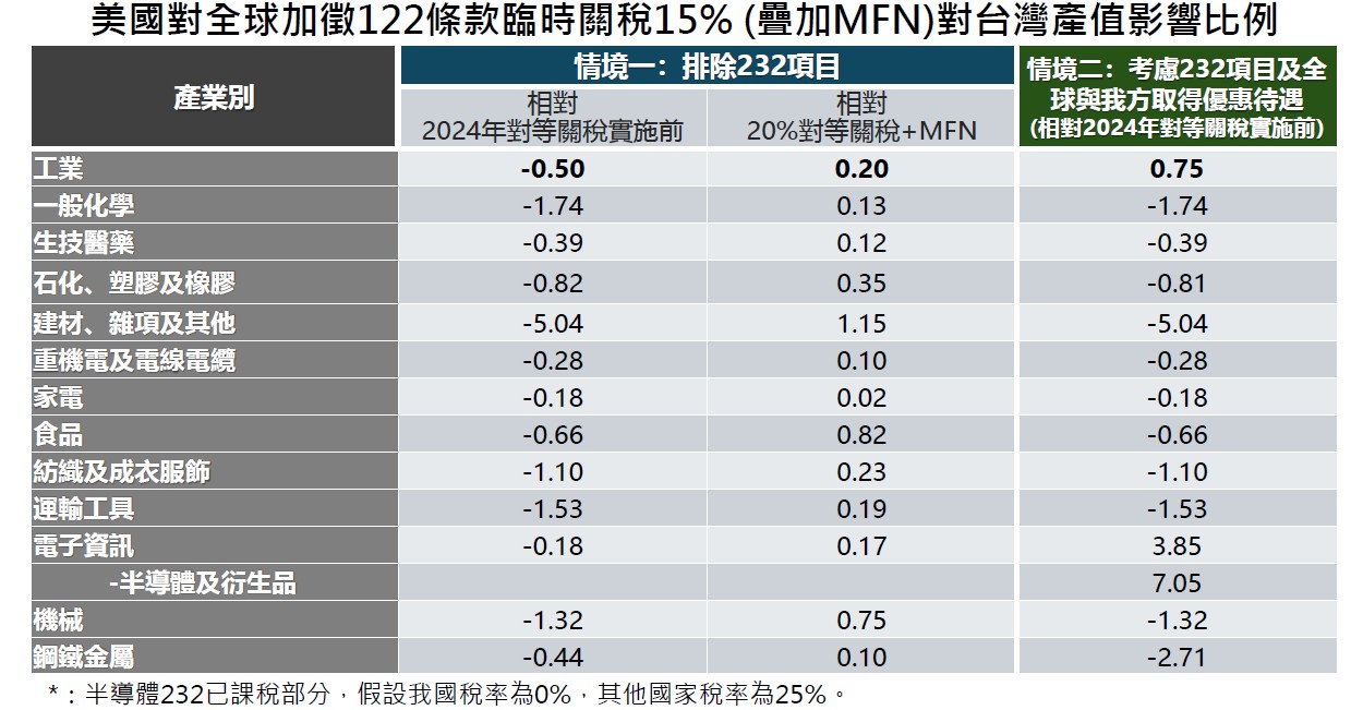 至於臨時關稅的影響,經濟部指出,經智庫採部分均衡模型,初步估算美國對全球加徵122條款臨時關稅15%(疊加MFN)對我國農工影響如下: