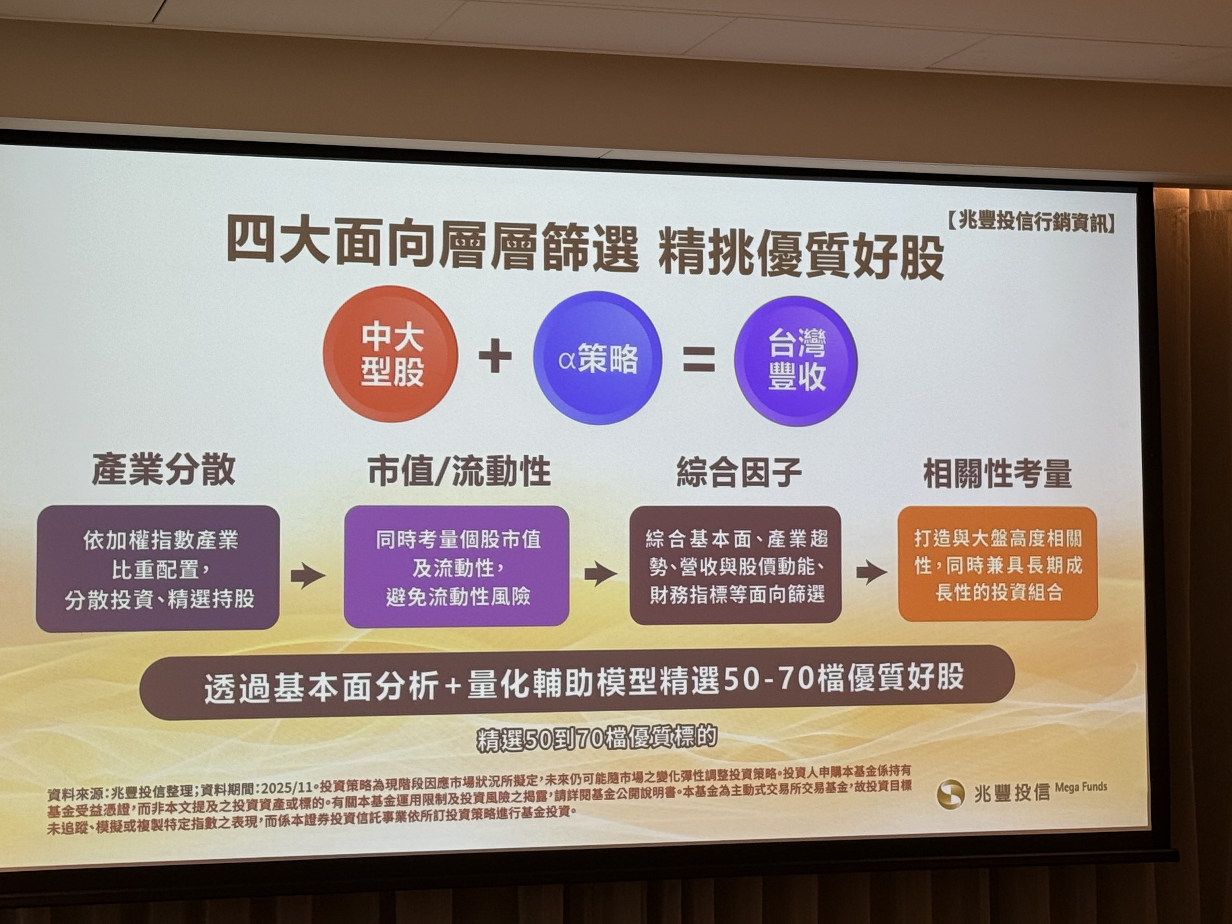 00996A擬任基金經理人王仲良指出,所謂的雙重選股策略,也就是精選權值股+潛力股,預計將6成以上資金配置於具備現金流穩定、競爭力突出的中大型「豐收型企業」,這不僅是各產業指標股,更是投資組合的穩健基石(β增值),為投資人提供下檔保護。