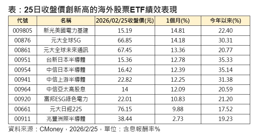20檔海外股票ETF收盤創新高 海外電力、半導體主題當紅!