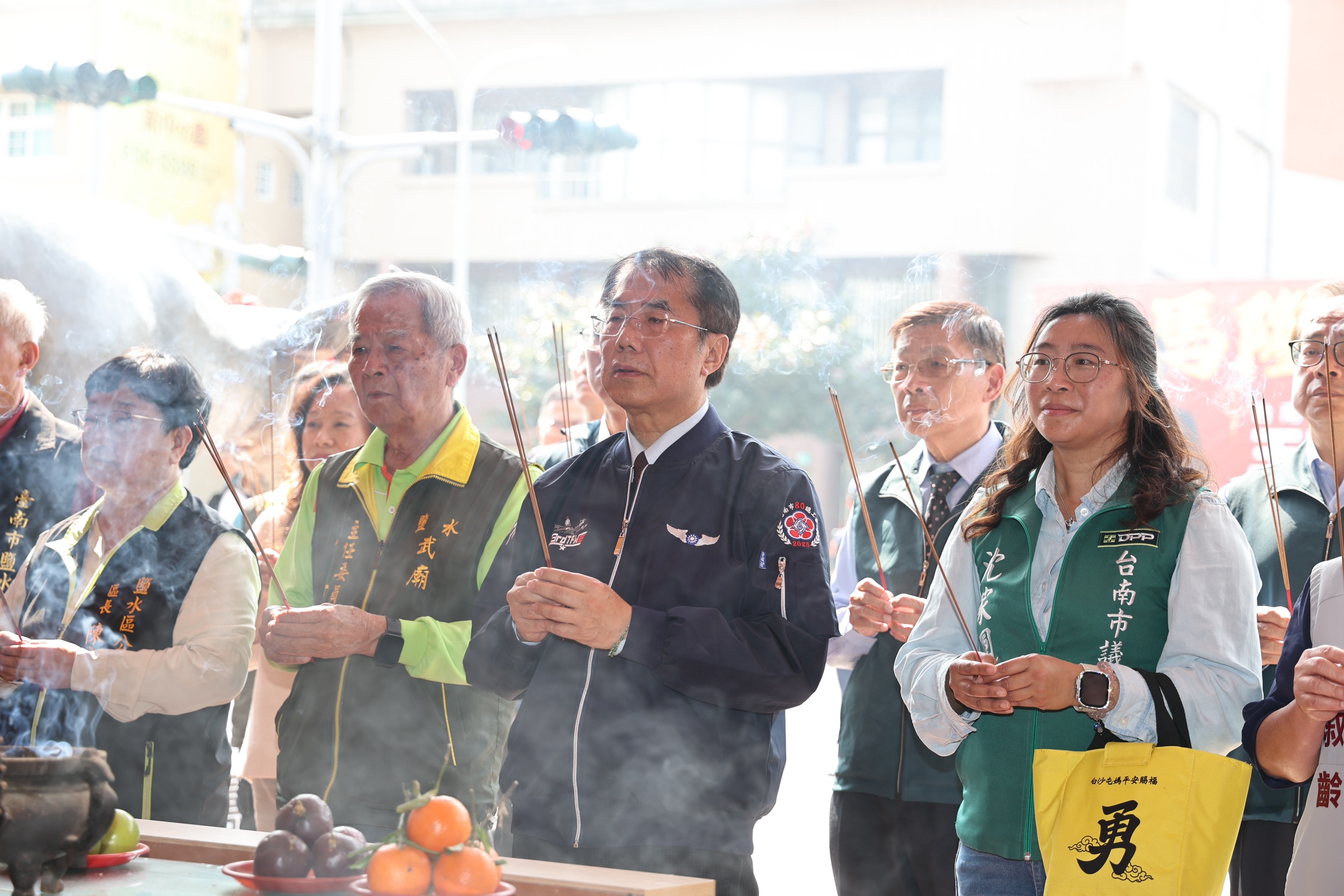 圖說:黃偉哲與鹽水武廟及地方民代共同祈福,祝願蜂炮活動順利平安。(圖片來源/台南市政府提供)