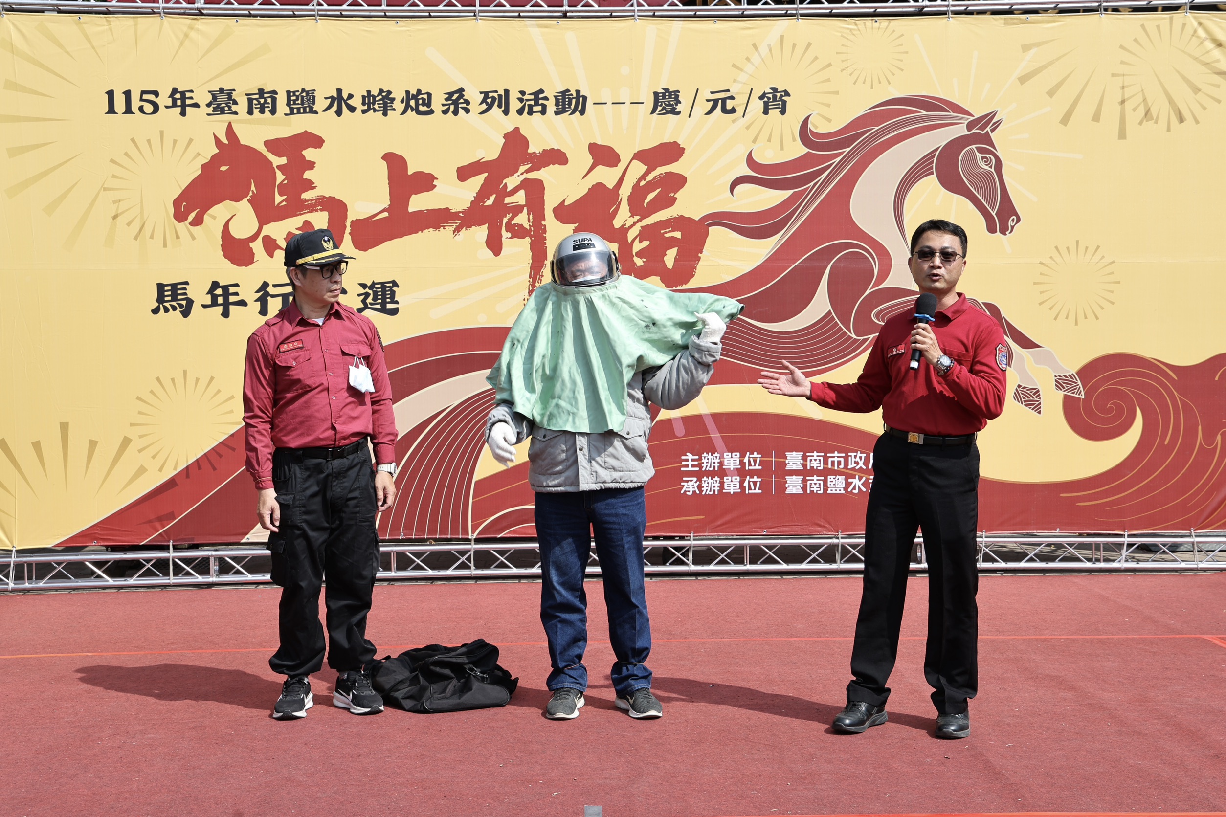 台南市府提醒,蜂炮體驗以安全為首要原則。消防局於現場示範完整防護穿著,建議民眾穿著非可燃性材質衣物,包括全罩式安全帽、棉質毛巾保護頸部、口罩、厚外套與長褲、棉質手套、棉質襪子及運動鞋等,避免燙傷或意外受傷。參與時應選擇設有合格標誌的炮城,並與炮城保持至少10公尺以上距離,確保安全。