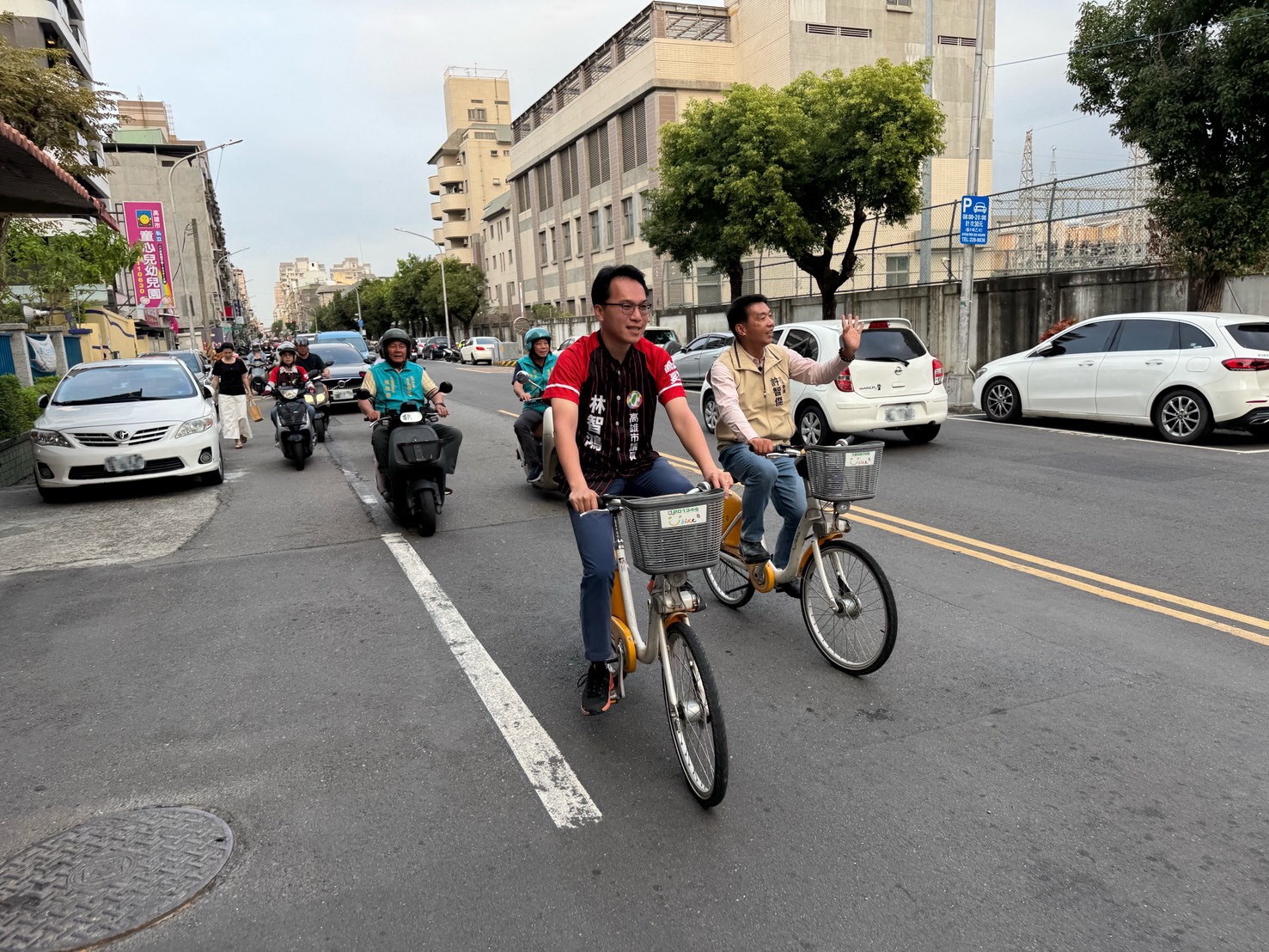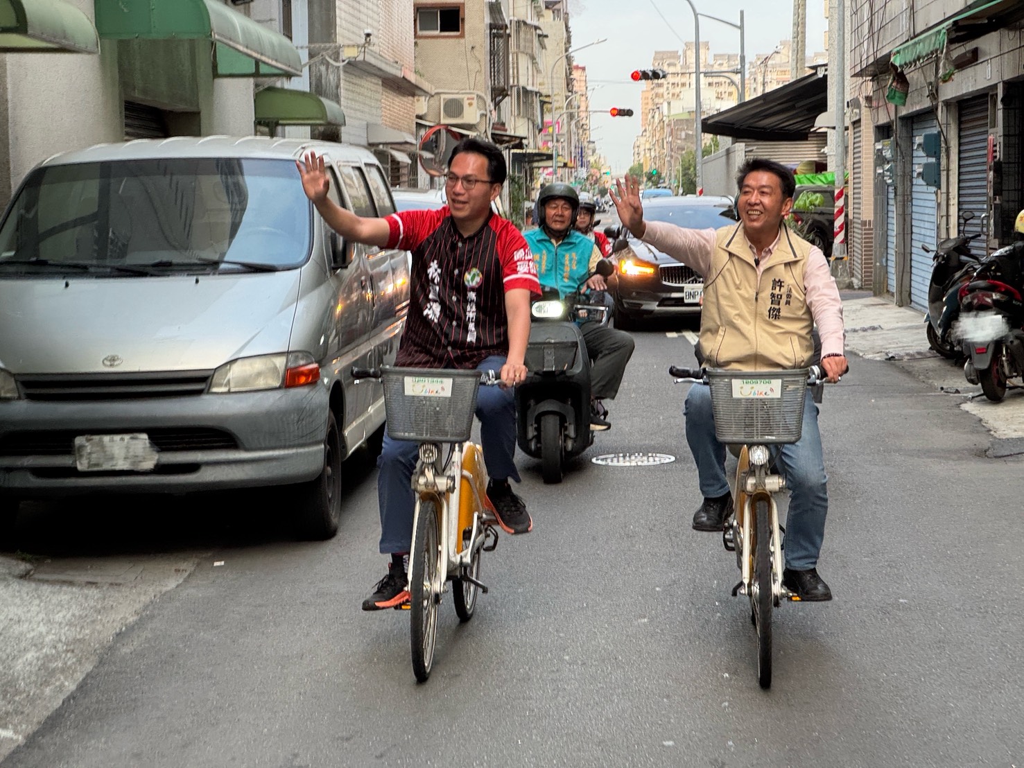 ↑圖說:立委許智傑展現鳳山大學長風範,跨派系相挺參與初選的議員林智鴻,一同騎腳踏車掃街。(圖片來源:林智鴻辦公室提供)