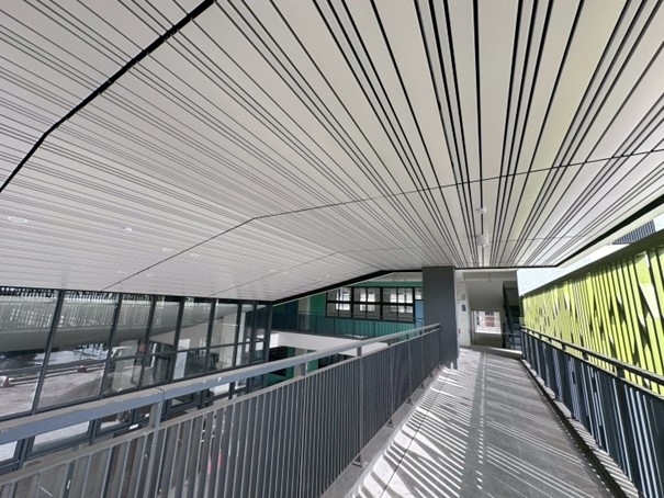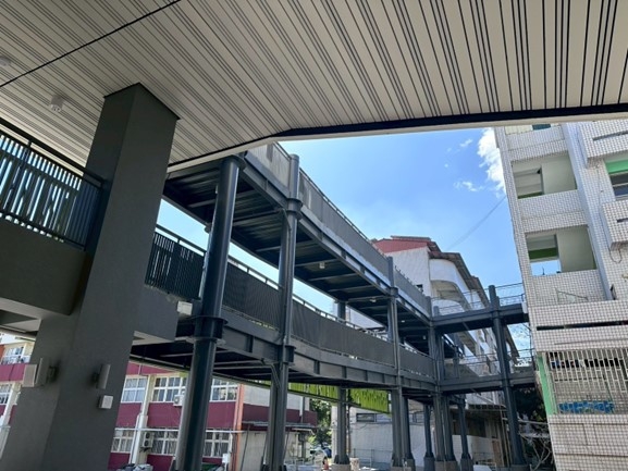 ↑圖說:地上四層圖書資訊大樓增設連接走廊與電梯系統,串聯仁愛樓與勵志樓,改善校園無障礙動線及物資運送需求。(圖片來源:高雄市工務局提供)