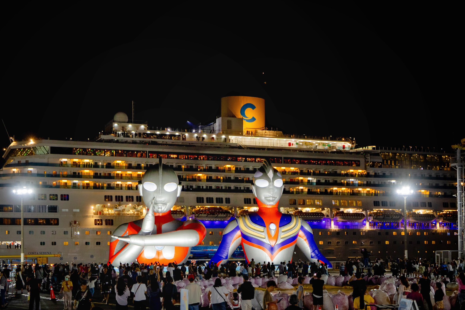 ↑圖說:初代超人力霸王、超人力霸王迪卡於17號碼頭與歌詩達郵輪合影。(圖片來源:高雄市觀光局提供)