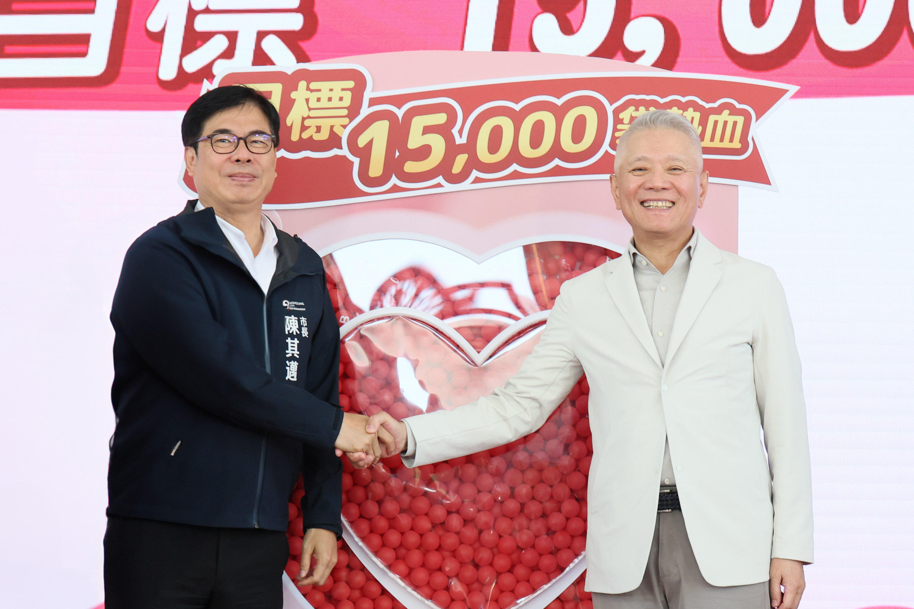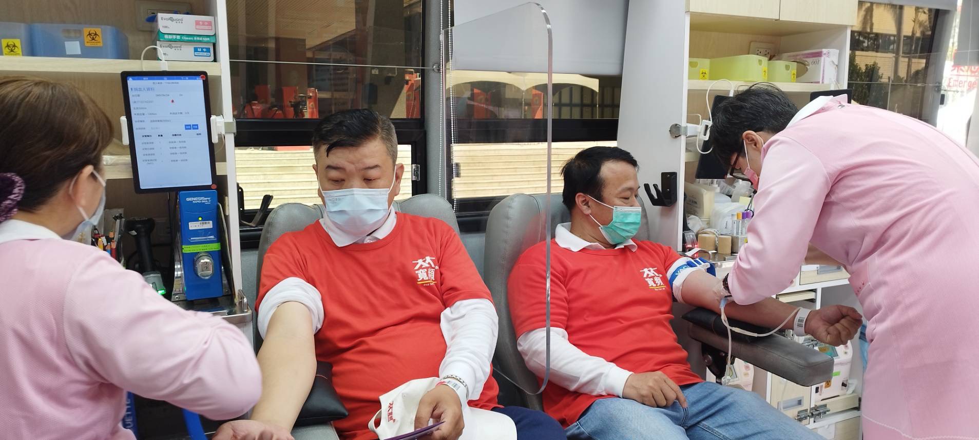 ↑圖說:陳其邁(左)攜手戴永輝挑戰全台捐血1.5萬袋的目標。(圖片來源:大大數位基金會提供)