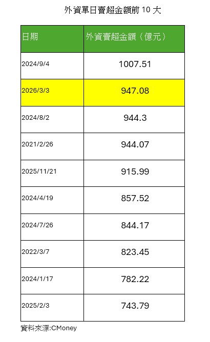 外資今天大砍賣超947億元,創下史上單日第二大賣超記錄;投信買超40.2億元,自營商賣超46.3億元,避險賣超203.5億元,三大法人合計賣超1154億元。