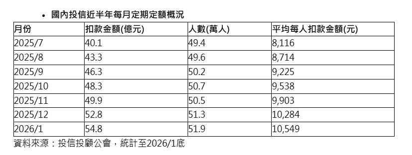投信投顧公會最新統計,截至今年1月底,向國內投信業者定期定額申購基金的人數約52萬人,累計近6個月增加2.5萬人,扣款金額也顯著提升,單月約55億元,累計近6個月增加近15億元、增幅37%。而且平均每人每月扣款金額已連續兩個月超過1萬元。
