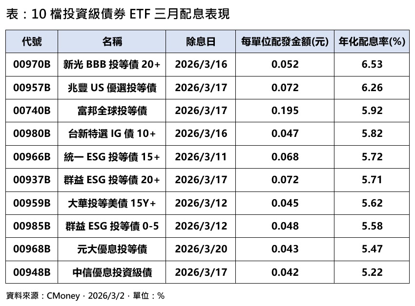 投資等級債券ETF,3月共計19檔將陸續除息,法人統計年化配息率前10高,其中,新光00970B、兆豐00957B年配息率都突破6.2%,另外,富邦00740B、台新00980B、統一00966B、群益00937B與大華00959B等,年化配息率也超過5.5%。