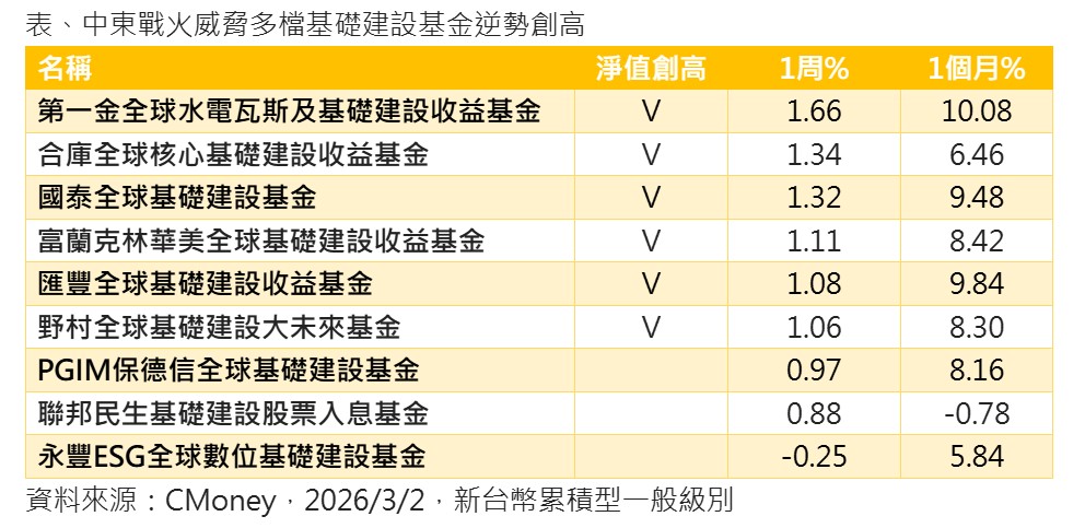 統計至3月2日,還是有少數的全球股票型基金,淨值逆勢創新高,其中又以具備防禦特性的基礎建設基金佔最多數,以9檔主打基礎建設主題的全球股票型基金來看,包括第一金全球水電瓦斯及基礎建設收益基金、合庫全球核心基礎建設收益基金、國泰全球基礎建設基金、富蘭克林華美全球基礎建設收益基金、匯豐全球基礎建設收益基金、野村全球基礎建設大未來基金等都創新高。