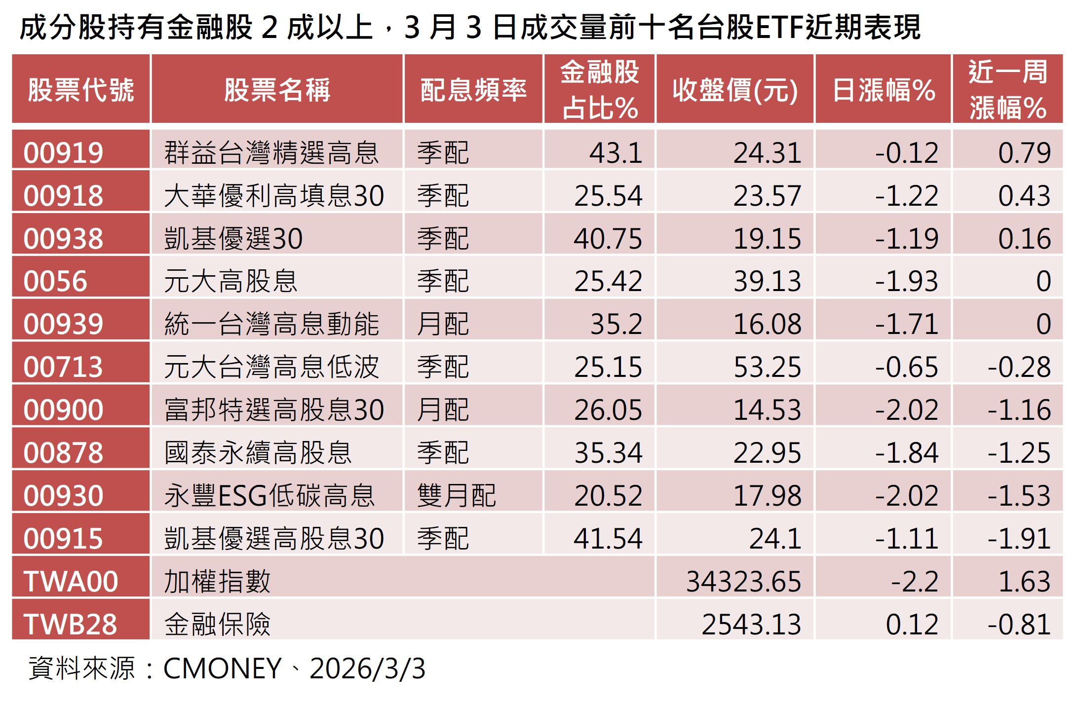 以3月3日價量表現來看,00919成交量36.4萬張最熱絡,股價小跌0.12%也是最抗跌,再以近一周來看,00919上漲0.79%績效居冠。