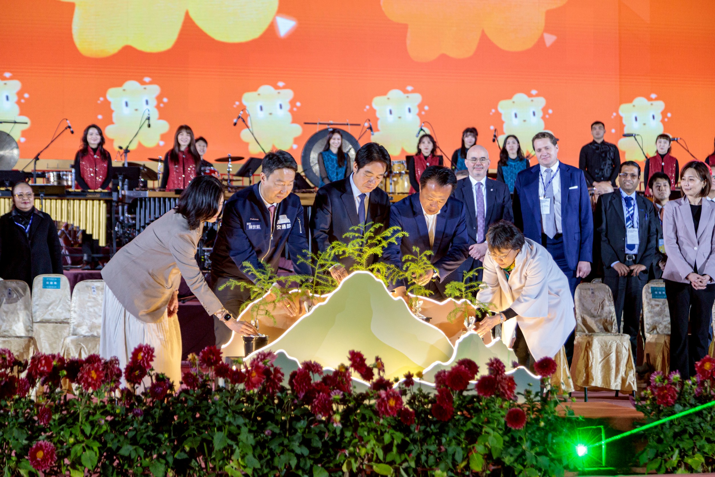 ↑圖說:總統賴清德、嘉義縣長翁章梁、交通部長陳世凱、內政部長劉世芳、觀光署長陳玉秀等貴賓共同種下象徵希望的樹苗,並啟動主燈「光沐-世界的阿里山」。(圖片來源:嘉義縣政府提供)