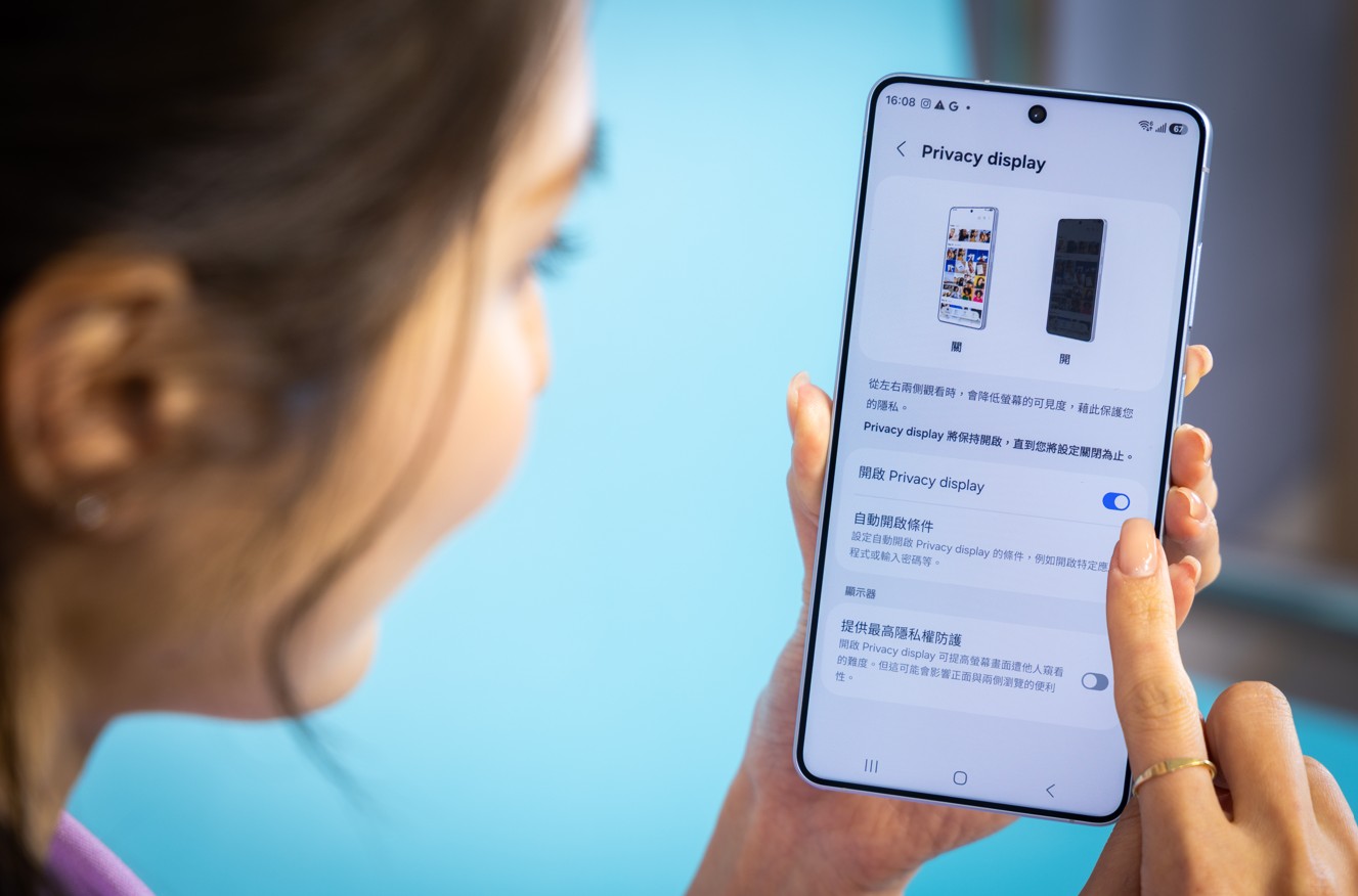 Galaxy S26 Ultra為全球首款內建智慧防窺的手機(如上圖,台灣三星提供),不同於傳統的防窺保護貼,當Galaxy內建的智慧防窺處於關閉時,可維持各方向的完整視角;而在啟動後,則能有效降低側邊視角的可視度,即使切換螢幕的橫向與直向模式,亦能發揮側面防窺效果。