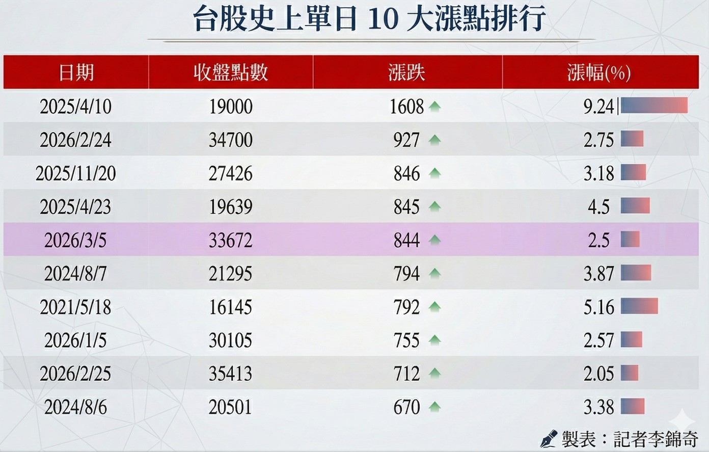 美股昨晚全面反彈,舒緩市場恐慌,韓股今天強彈9.6%,日股也反彈1.9%,加上台積電ADR反彈上漲1.22%,帶動台股今(5)日開盤跳空反彈791點,盤中甚至大漲1490點,寫下歷史盤中第2高漲點記錄。不過,賣壓逐漸出現,漲點竟然大幅收斂846點,終場上漲844點至33672,也改寫單日第5大漲點,漲幅2.5%,一吐怨氣,成交量7617億元。