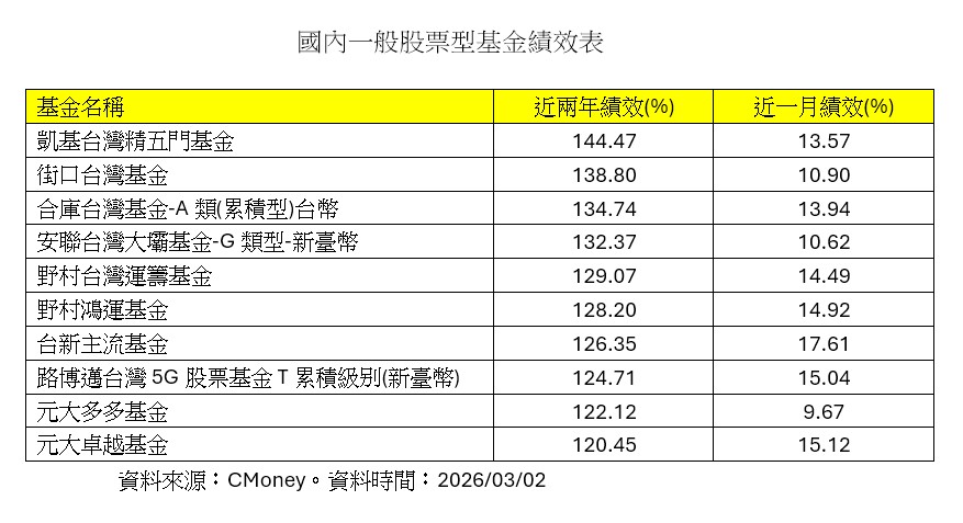 整體來看,台股基金近150檔,近2年績效突破100%的就有47檔,其中前五名除凱基台灣精五門基金,還包括街口台灣基金、合庫台灣基金-A類(累積型)台幣、安聯台灣大壩基金-G類型-新臺幣,及野村台灣運籌基金,含息報酬率都超過129%。