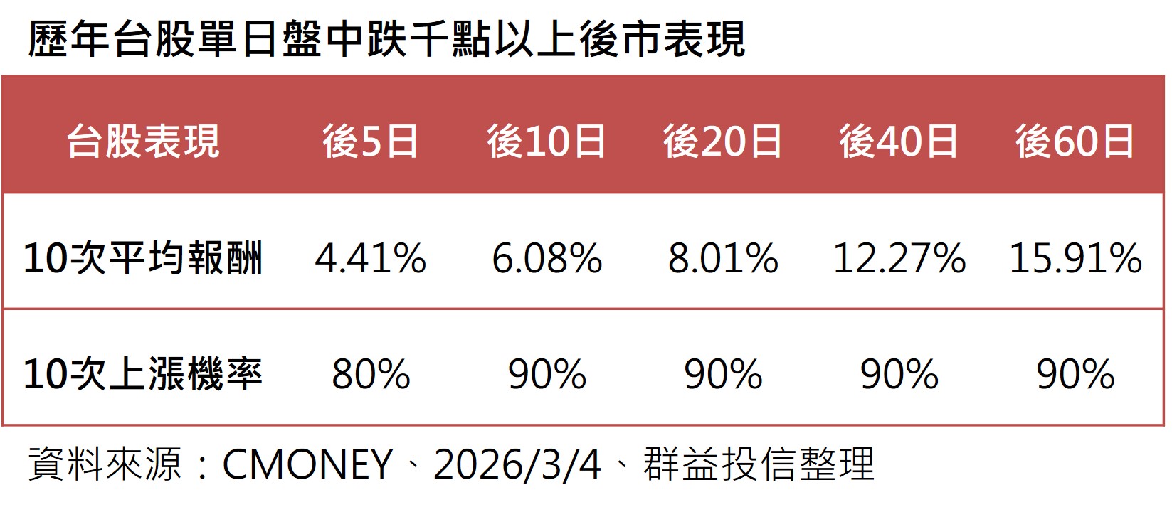 群益投信統計過去台股若在盤中大跌千點以上,共有10次,觀察後5日、10日、20日、40日、60日平均上漲4.41%、6.08%、8.01%、12.27%、15.91%,正報酬機會也都約九成。