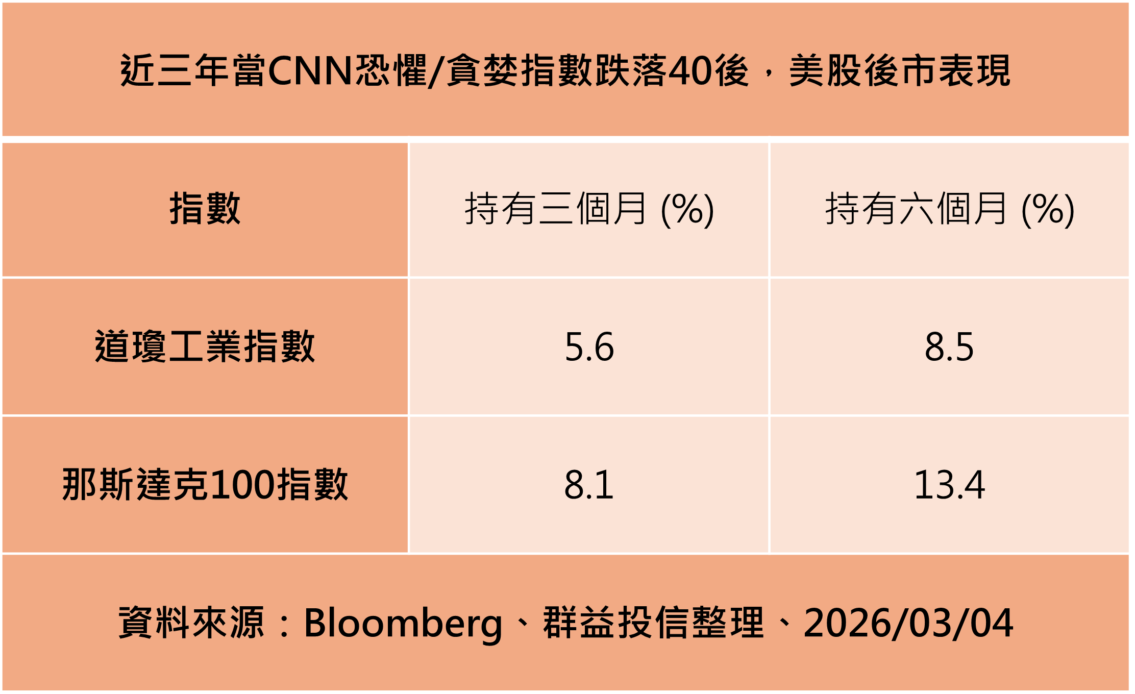 群益投信主動式ETF投資團隊表示,根據過往經驗,當CNN恐懼與貪婪指數低於40、落入恐慌區間之際布局美股,道瓊工業指數後三月平均漲5.6%、後六月漲8.5%,而具備趨勢題材與獲利加持的成長股表現更佳,NASDAQ 100指數後三月平均漲8.1%、後六月平均漲13.4%。