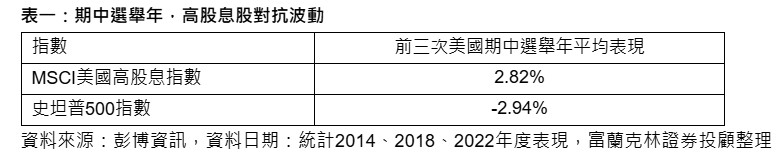 事實上,今年本為美國期中選舉年,過往都是美國總統四年任期中股市表現相對較落後的一年。但根據富蘭克林證券投顧統計,期中選舉年波動較大,前三度美國期中選舉,美股史坦普500指數平均修正2.94%,但具較高收益支撐的美國高股息股則上漲2.82%。