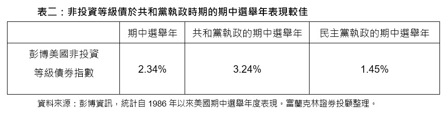 另一個有趣的統計則是與景氣、股市連動較高的非投資等級債券,往往在共和黨執政的期中選舉年表現更為突出,其3.24%的平均漲幅甚至領先民主黨執政期間超過2倍以上的表現。