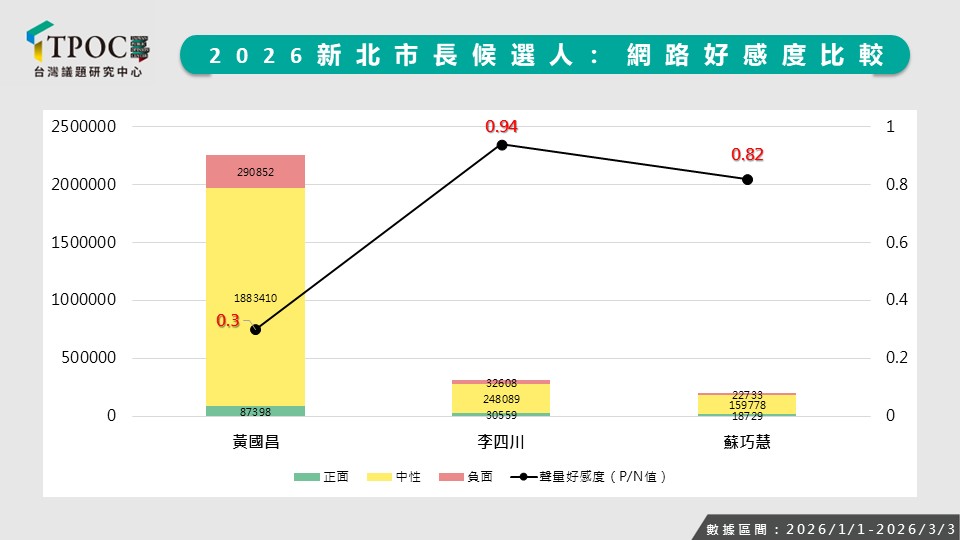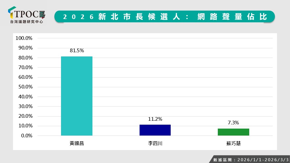 根據TPOC台灣議題研究中心最新統計數據,自2026年初至3月3日,黃國昌在網路聲量佔比上展現驚人氣勢,以81.5%的支持度徹底「輾壓」其他潛在的競爭對手,遠超國民黨李四川(11.2%)與民進黨蘇巧慧(7.3%),話題性十足。黃國昌憑藉著81.5%的壓倒性聲量,形同在網路戰場上握有絕對的「麥克風控制權」,展現出極其剽悍的議題設定能力。