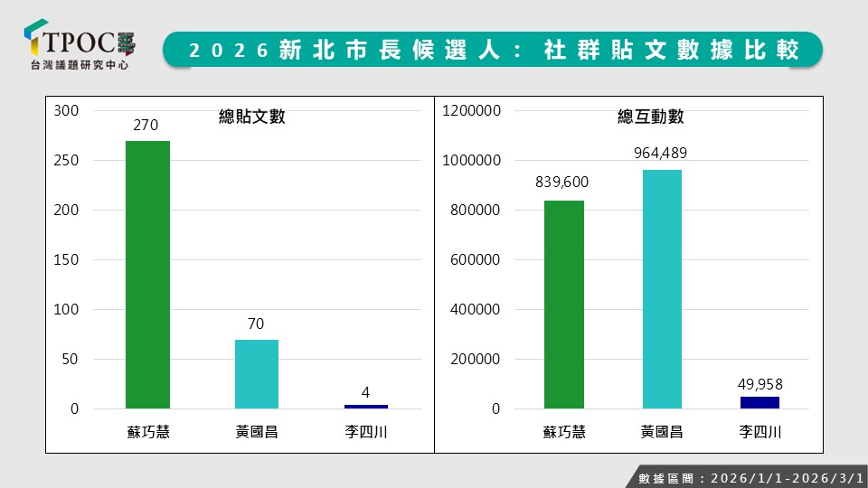 而更令人不解的是國民黨的李四川,在競爭激烈的新北市長選戰,李四川竟然只發了4則貼文,累積互動僅4.9萬次。這種近乎「數位隱居」的表現,在黃國昌與蘇巧慧的火力交織下,顯得格格不入。當對手已經在自媒體經營搶攻選票,而李四川似乎還沒有準備好當國民黨的新北市長候選人?