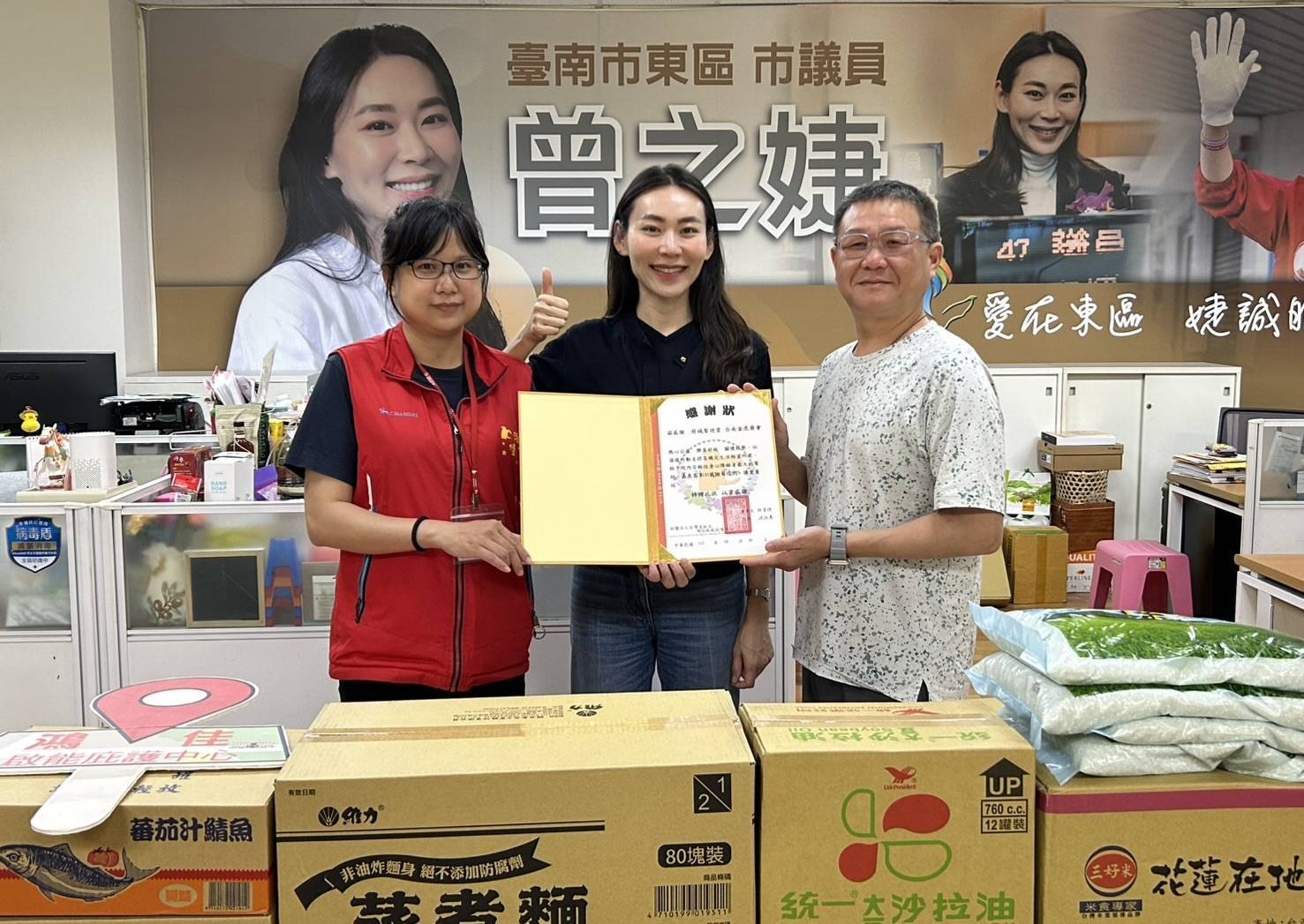 圖說:台南市議員曾之婕媒合府城聖巡堂台南金虎爺會將祝壽物資轉贈台灣護家協會與鴻佳啟能庇護中心,將宗教壽禮化為愛心物資,關懷弱勢族群。(圖片來源/ 記者林薇安攝)