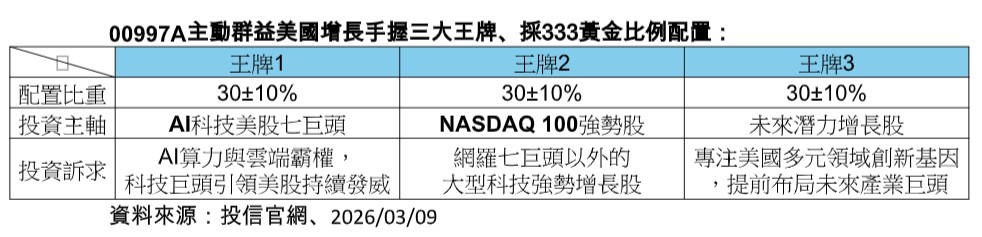 群益投信即將推出全台第一檔佈局範圍囊括美股全產業的主動式美股ETF「00997A主動群益美國增長」,採333黃金比例配置,三大方向包括美股科技七巨頭,以及七巨頭以外的NASDAQ 100強勢科技增長股,第三方向則是非科技業的未來潛力增長股,諸如受惠於川普確立重塑美國太空政策的國防航太族群,以及軍工股、金融創新類股。