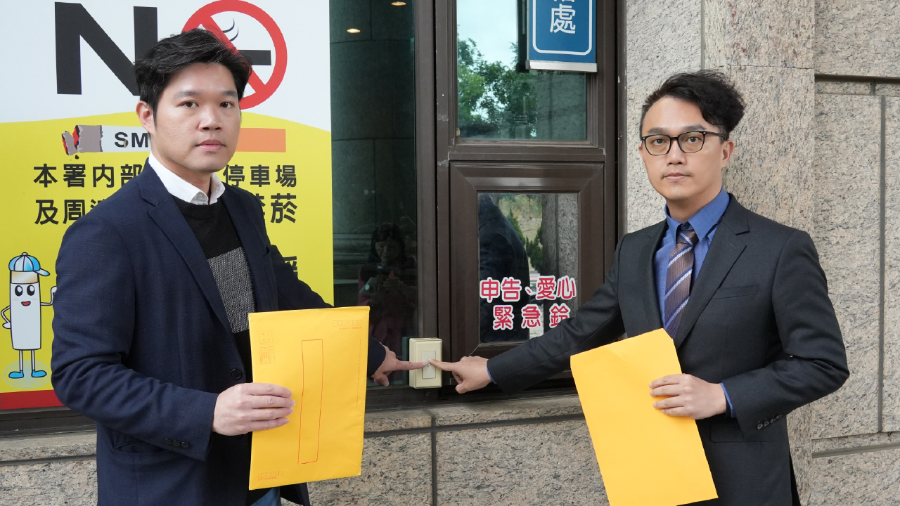 ↑圖說:電話民調竟稱徐欣瑩已脫黨參選,徐欣瑩辦公室委發言人徐維遠(左)及委任律師練鴻慶前往新竹地檢署按鈴控告,盼檢方迅速追查幕後主使者。(圖片來源:徐欣瑩辦公室提供)
