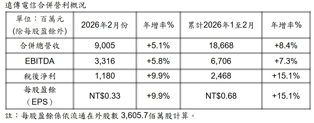累計前2月,遠傳合併總營收、合併EBITDA及稅後淨利分別為186.68億元、67.06億元與24.68億元,年成長率分別為8.4%、7.3%與15.1%;累計每股盈餘(EPS)0.68元。