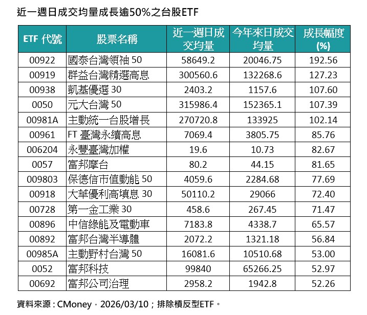 顯示台股受中東戰事拖累重挫之際,對台股後市看多的投資人,趁大盤出現明顯修正,透過表現貼近台股加權指數的市值型ETF逢低進場布局,搶先卡位後續反彈行情。
