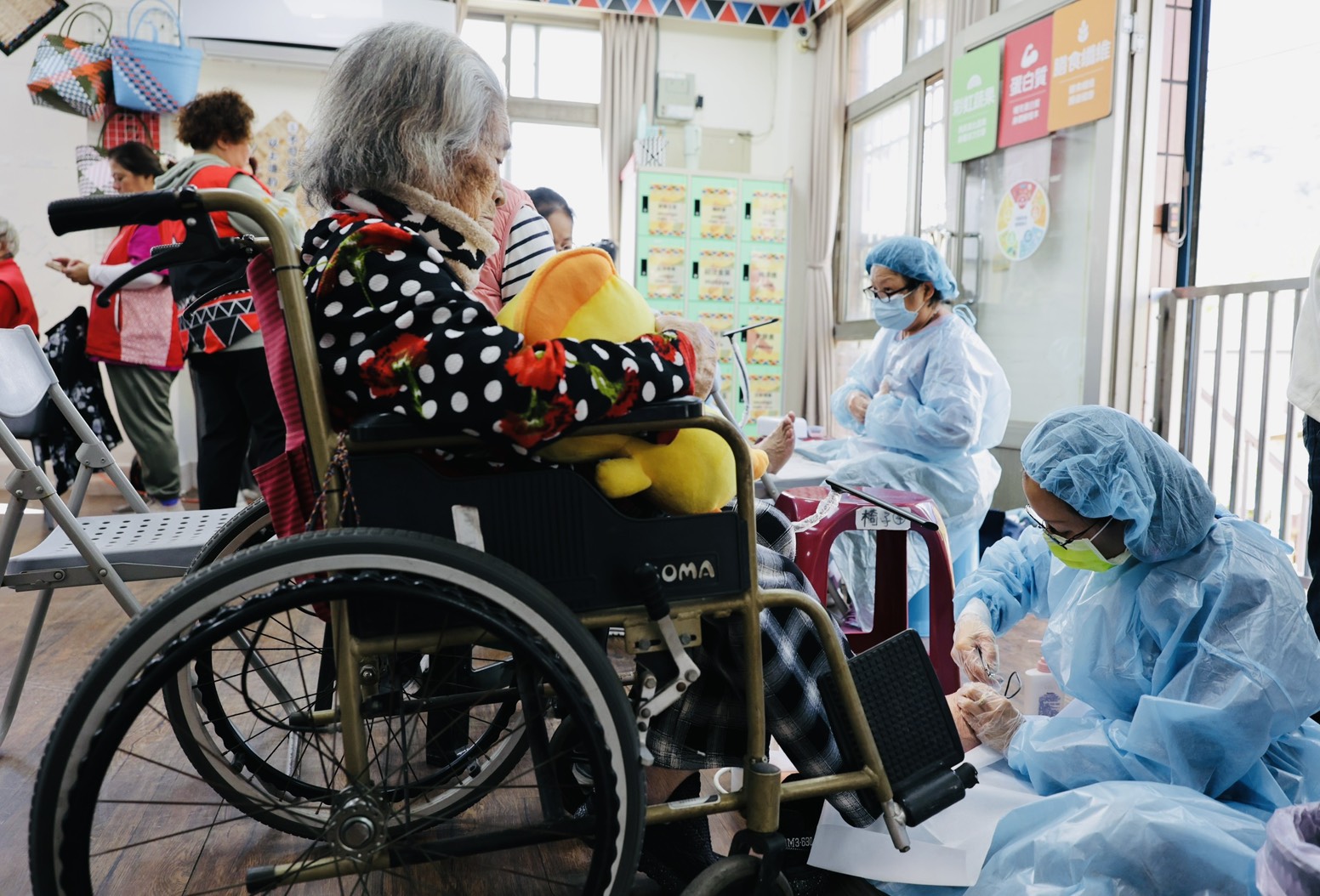 圖說:現場專業志工為長者足部修剪趾甲並評估健康,達預防效果。圖/台灣甜豆文藝及健康促進協會提供