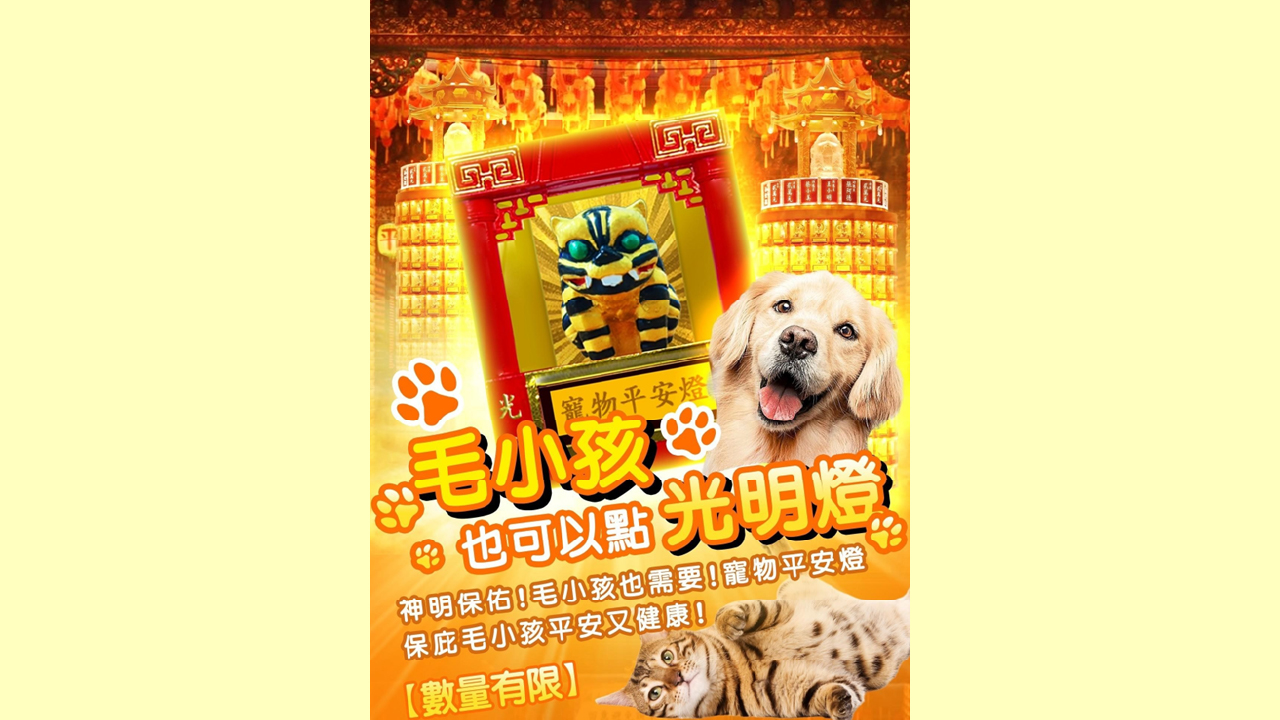 但寵物飼主想幫毛孩子點光明燈、求平安,要先注意禁忌,以免祈福不成,招致負面影響。寵物光明燈的保護神是虎爺、天狗將軍、義犬公,藉由點光明燈的功德,獲得神佛菩薩的加持保佑,讓寵物元辰光彩、消災解厄、健康平安。