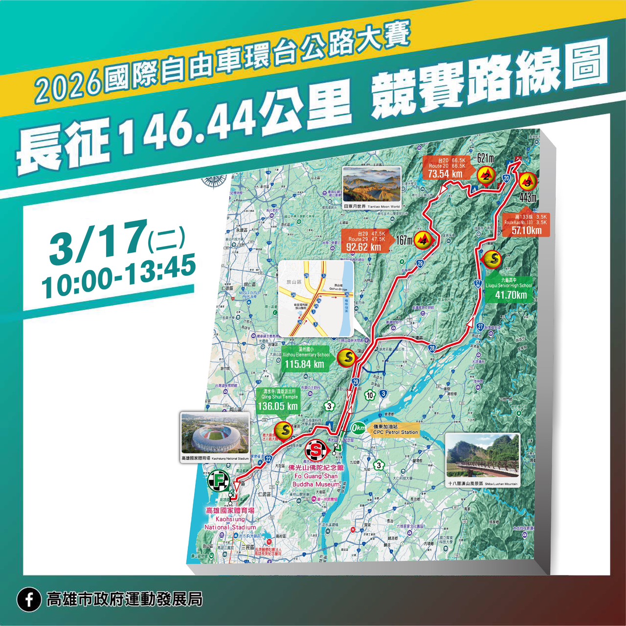 「2026國際自由車環台賽」高雄站即將於3月17日登場,這場由國際自由車總會(UCI)登錄的1級賽事,將有23支國際車隊、近200名菁英職業選手同場競速。高雄站賽事從佛光山佛陀紀念館出發,沿途行經山城與都會區共11個行政區,最終抵達高雄國家體育場,全程146.44公里。為確保賽事順利進行與市民安全,高雄市警察局將針對沿線道路實施分階段交通管制,提醒民眾提前規劃行程並配合交管措施。