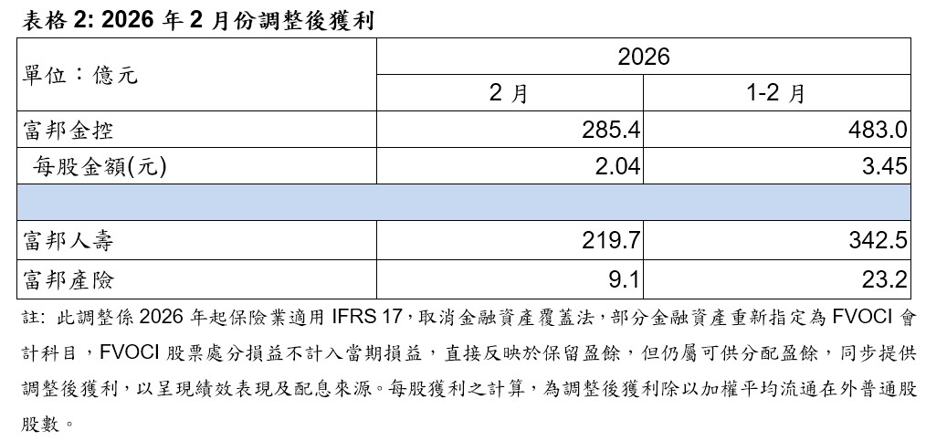 若加計透過其他綜合損益按公允價值衡量(FVOCI)之股票處分損益,富邦金控2月調整後獲利285.4億元,累計前2月調整後獲利483億元、每股獲利為3.45元。