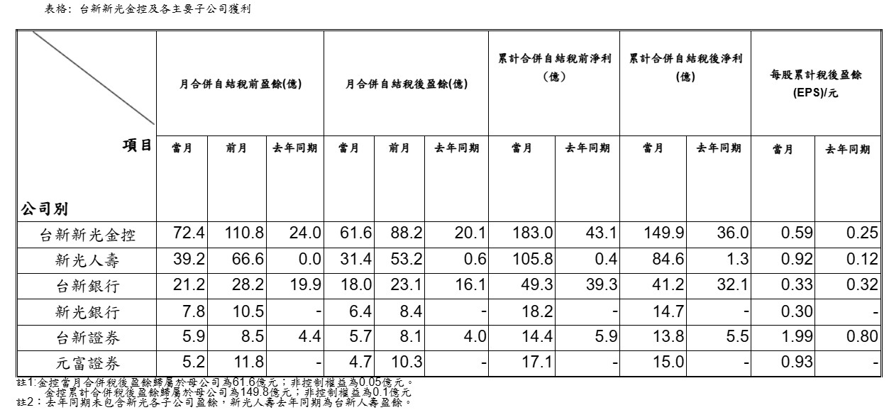 台新新光金控2月自結稅後淨利約61.6億元,年成長206%,累計前2月稅後淨利149.9億元,年成長316%,每股稅後淨利(EPS)為0.59元,創歷史新高。