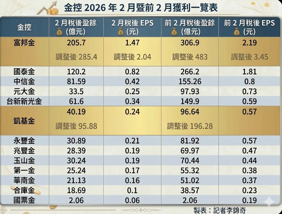 金控2月獲利全數出爐,富邦金控自結2月稅後淨利205.7億元,創歷年2月歷史新高;累計前2月合併稅後淨利306.9億元、每股稅後盈餘(EPS)為2.19元,重返金控獲利王座。