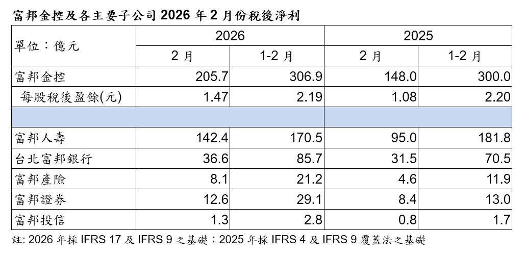 獲利冠軍富邦金控2月自結合併稅前淨利207.5億元、稅後淨利205.7億元,創下單2月歷史新高紀錄;累計今年前2月合併稅前淨利339.1億元、稅後淨利306.9億元、每股稅後盈餘(EPS)為2.19元。