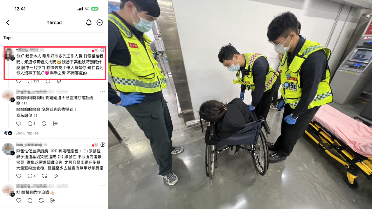 她表示,當時剛好有一名女子走進廁所,她只能斷斷續續地向對方求助,說出「救我」、「救護車」等簡短字句。對方雖然一開始受到驚嚇,但仍立即幫忙並迅速向賣場工作人員求援,協助聯繫救護人員,才讓她能及時獲得醫療協助。